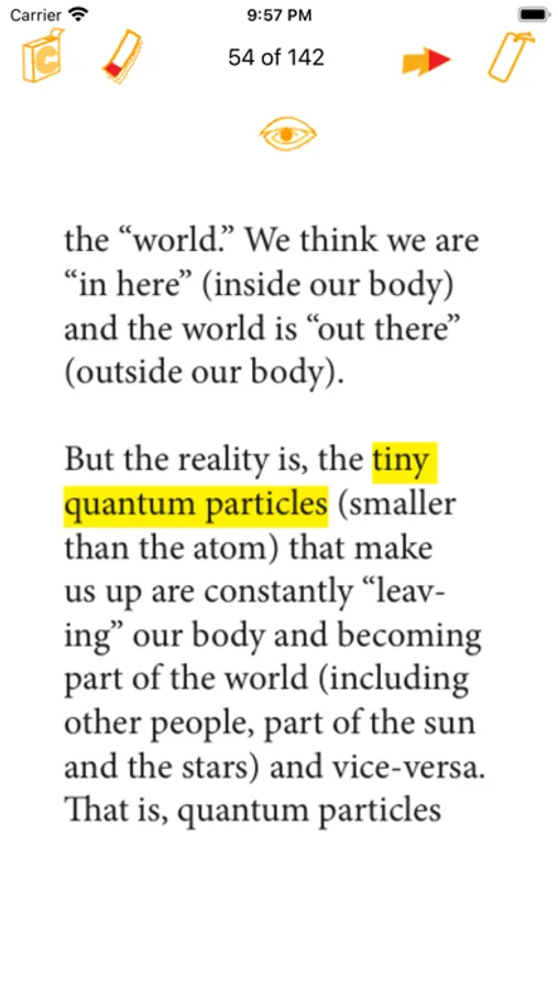 Remembers your place in the book. Tap on 'Bookmarks' icon to jump to your personal bookmarks.