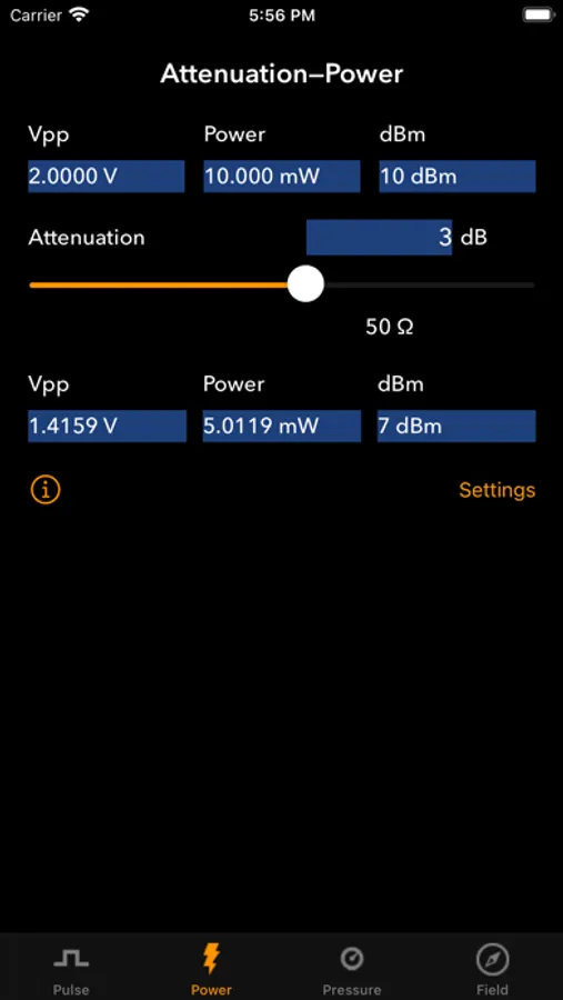 You can specify an input voltage (Vpp or Vrms) and dB of attenuation to get the output voltage, power and attenuation. The impedance can be specified, typically 50Ω for most systems.