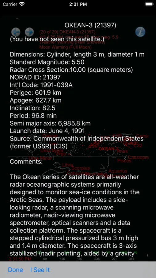* Tap on a satellite's name to view detailed information including country of origin, launch date, magnitude (brightness), and more