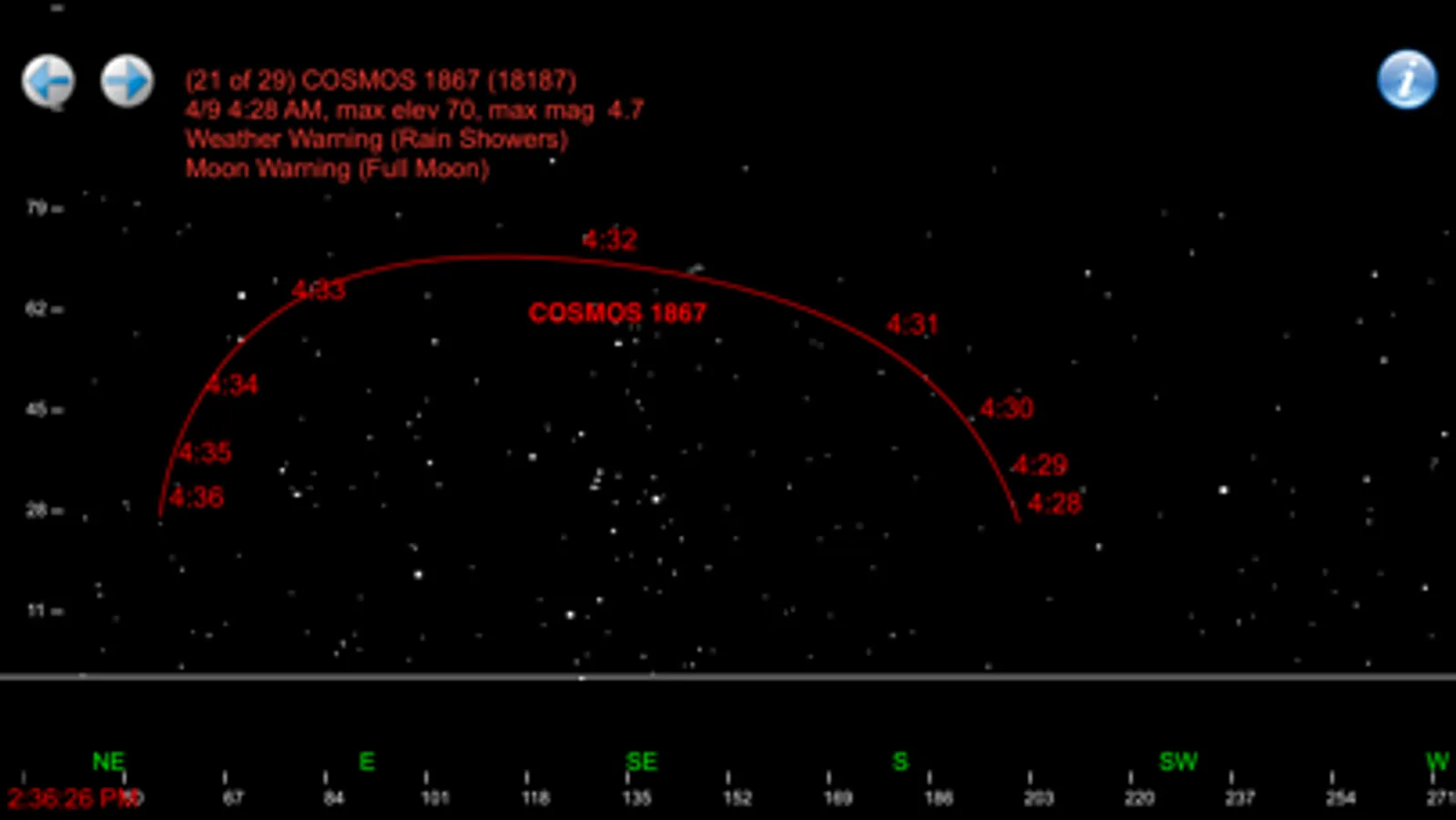 * Real-Time mode shows you what is in the sky now, with the current location, magnitude and path for each satellite. If multiple satellites are in the sky, it shows them all simultaneously