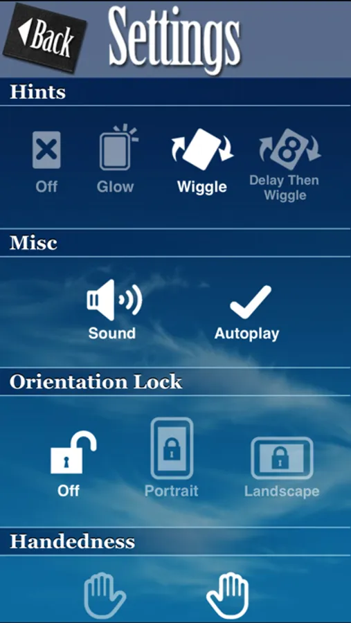 * Playable cards wiggle or glow -- turn off for a bigger challenge. The more the cards wiggle the better the move.