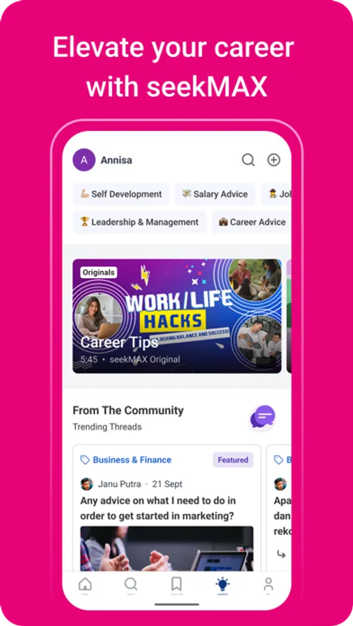 seekMAX builds on JobStreet's talent market expertise to bring you exclusive career resources insights and content. We help you grow your skills and career with free and unlimited access to thousands of bite-sized learning videos in English and Bahasa Melayu. Stay connected, build professional connections, and get the support you need from qualified experts, industry leaders and like-minded peers through community - right at your fingertips!