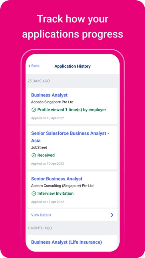 With a complete profile you can apply as easily as a single tap. Whether at home or in transit, Jobstreet app enables you to manage your job applications at any time on the go.