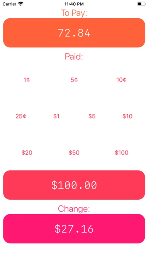You simply enter the total bill amount and tap the amount that was paid. The amount of change is shown immediately.
