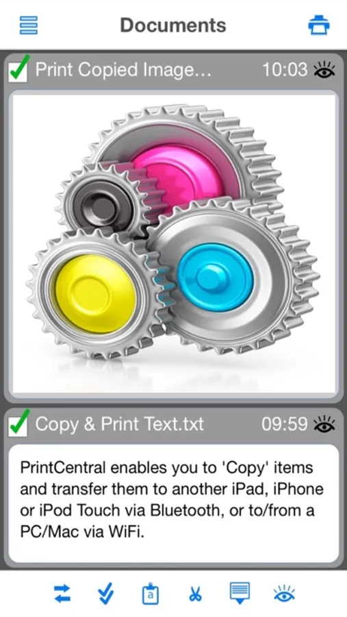 > Copy and transfer to another user's iPhone/iPod Touch using Bluetooth or WiFi (both devices require PrintCentral)