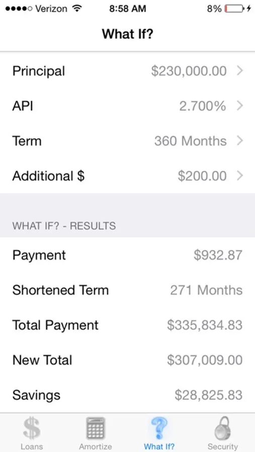 - "What If" calculator shows affect of additional principle payments to loan cost.