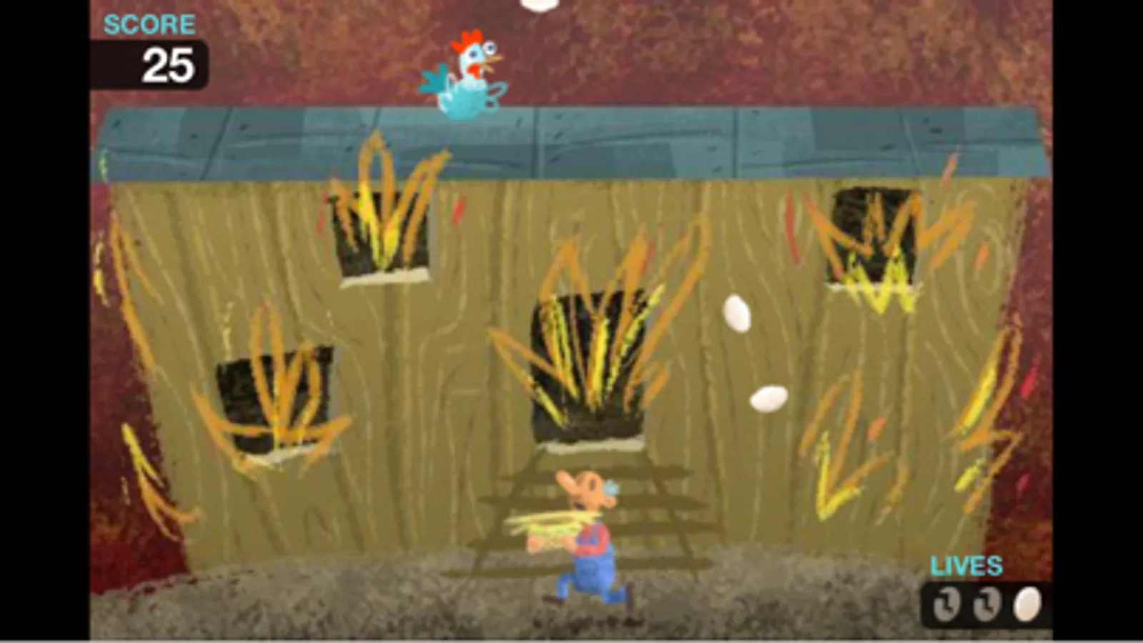 Bok-bok bok-Aaaagghh!! The henhouse is on fire! But that's not the worst of it — your prize hen has flown the coop, and she is hurling her eggs from the roof. Only one person is plucky enough to save the poor eggs: You! (Well, technically a farmer that you control by tilting your device, but you get the idea.) So get crackin'! Are you hard-boiled enough to pullet off and save breakfast, or will it be shell on earth?