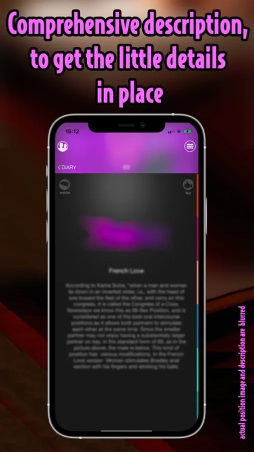 Quite easy and straightforward to browse and find visually any positions based on the postures of the two sexes. Tilting the device to landscape position you can find a detailed description with customizable names for easy understanding.