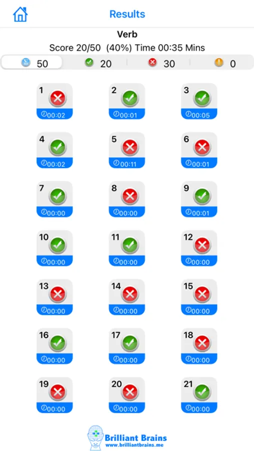 A summary of the practice test is presented at the end of each test. It shows you the time you took, the score, which questions you answered correctly and where you were wrong.