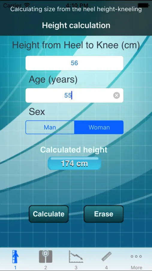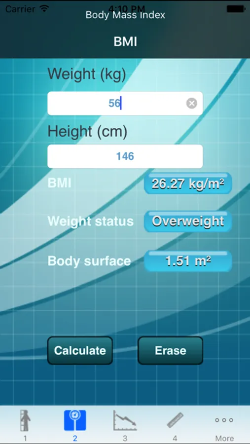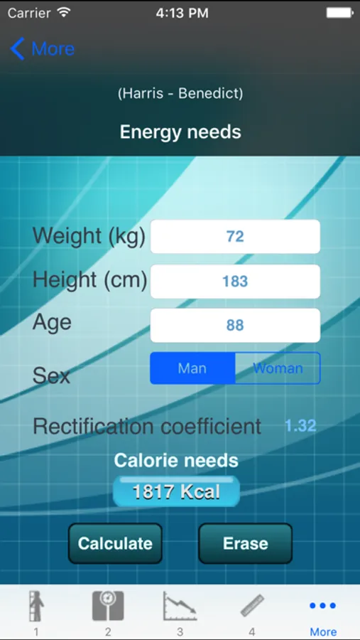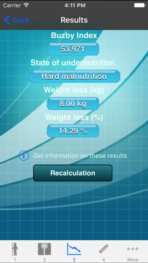 Simply fill a few data (measures, age...) to get various information such as your height, body mass, Buzby index, Pini index or energy needs.