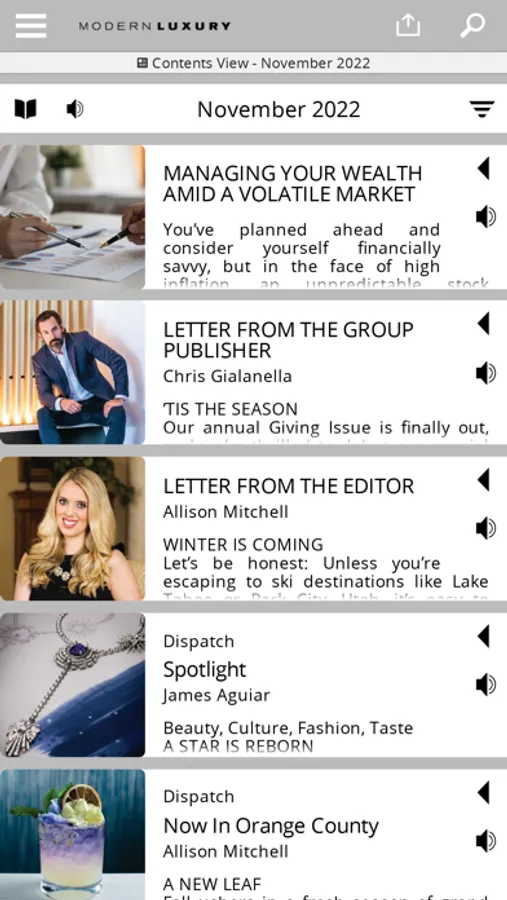 Download the absolute modern authority on Orange County today. Be among the first to read this award winning content on your iPhone and iPad. Whether it's a revealing celebrity profile, a special feature on the chicest trends in design, cutting-edge fashion spreads or an in-depth review of Orange County’s hot spots, Modern Luxury Orange County consistently engages the influential and affluent interested in this great metropolis.