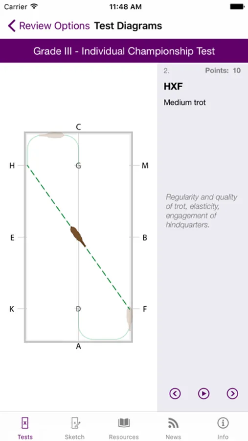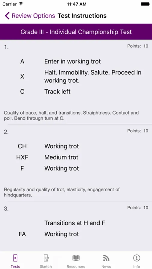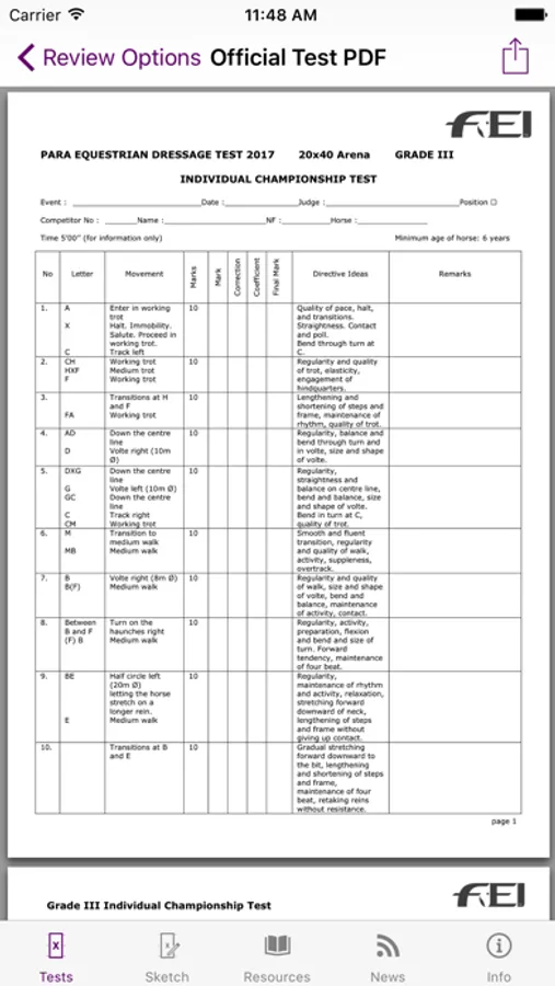 • Reference the official FEI dressage test score sheet to see how judges will mark the performance