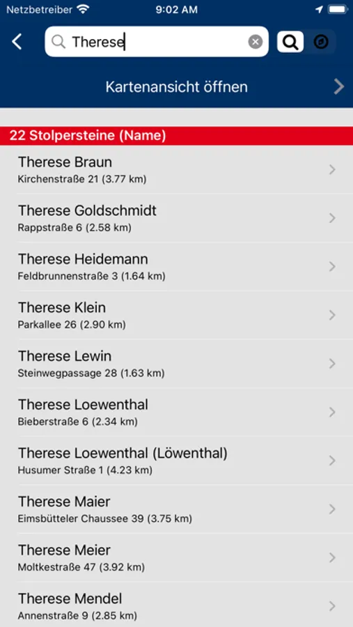 - Stolperstein-Suche nach Name, Straße, PLZ, Umkreis und Stadtteil.