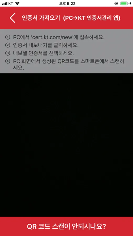 사용 중이신 ‘올레인증서’의 버전이 3.1.1 이하일 경우, 앱 스토어에서 ‘KT 인증서 관리’를 검색하신 후 업데이트를 진행하셔야 정상적으로 이용가능합니다.