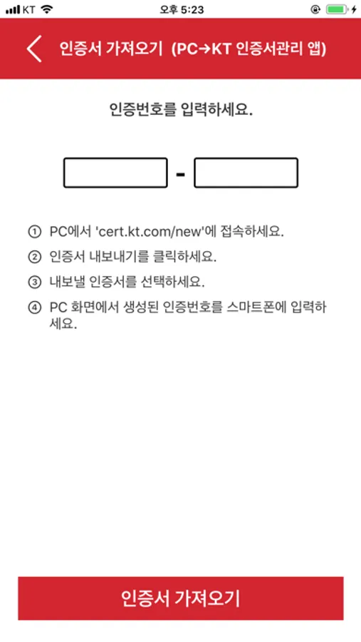 - 고객님의 PC에 저장되어 있는 공인인증서를 KT 인증서 관리를 통해 스마트폰에 복사하시어 스마트폰과 PC에서 동시에 다양한 공인인증서 기반 어플리케이션에서 활용하실 수 있습니다.