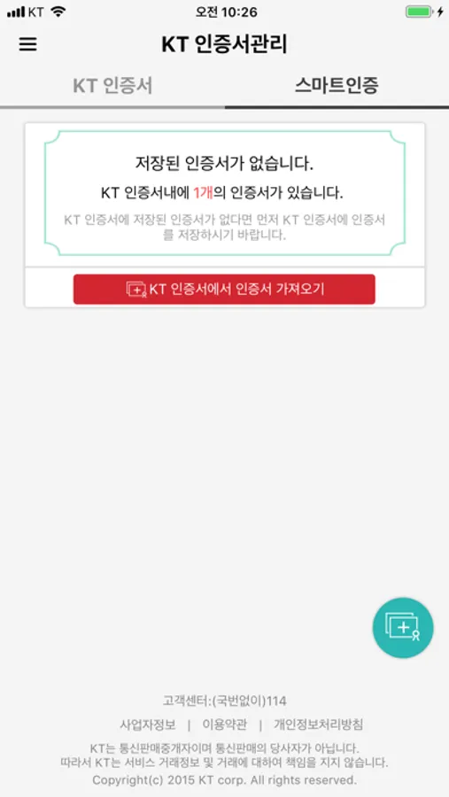 스마트인증 서비스는 애플 앱스토어의 '앱 내 구매' 방식으로 제공되고 있으며, KT 인증서 관리 무료 다운로드 후 서비스 가입을 위해 1년 이용권을 구매해야 합니다.