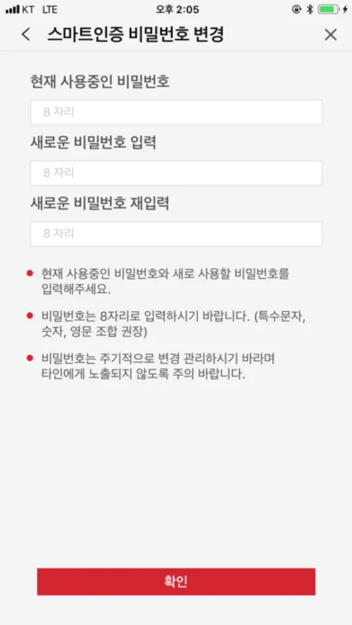 - KT 인증서 관리에 저장된 인증서 암호를 변경하실 수 있습니다.