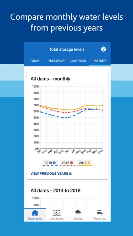 With the Melbourne’s Water Storages app you can access up to date information on Melbourne’s dam storage levels, catchment rainfall and daily water usage.
