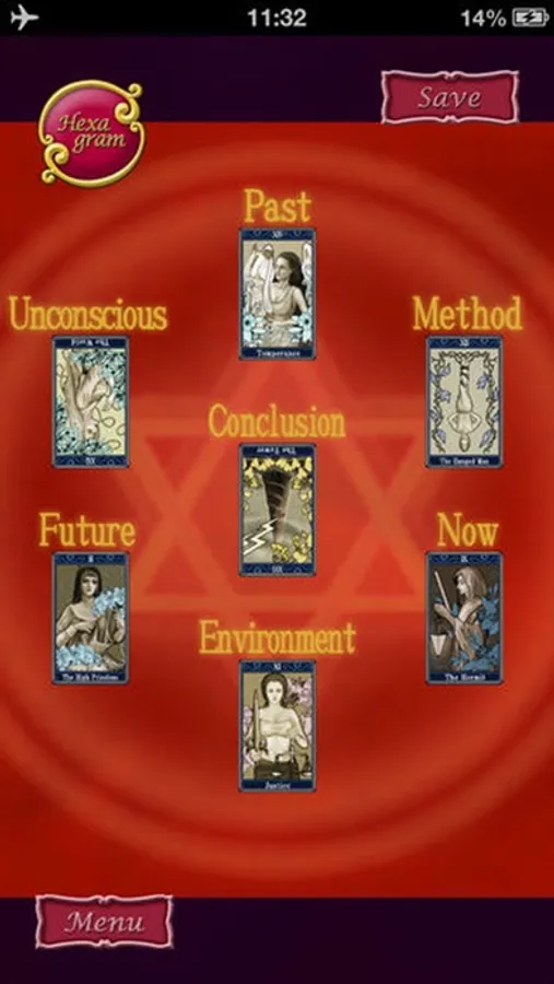 In the world of tarot, there are several ways to divine, called Spreads, and they bring out the meaning of each card. In this app, there are 2 kinds of spreads: "Hexagram" and "Seven Telling". "Hexagram" has broad utility and answers any kind of questions. On the other hand, "Seventelling" is perfect to divine your relationships including love and marriage.