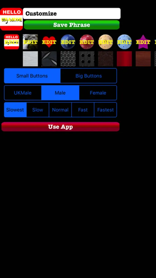 4) The TOP ROW/CATEGORY is customizable. You can customize the text for each button, and with the PRO version, the photos for those buttons. To do so, first touch HELP then select Custom mode. Next select a button, replace the text shown ("Customize" by default) with your custom text and touch Save Phrase. To replace a button with a photo from your library (PRO VERSION), while in Custom mode, touch the button then touch the larger version of the button and select a photo from your library. Touch HELP and User mode to return to user mode.