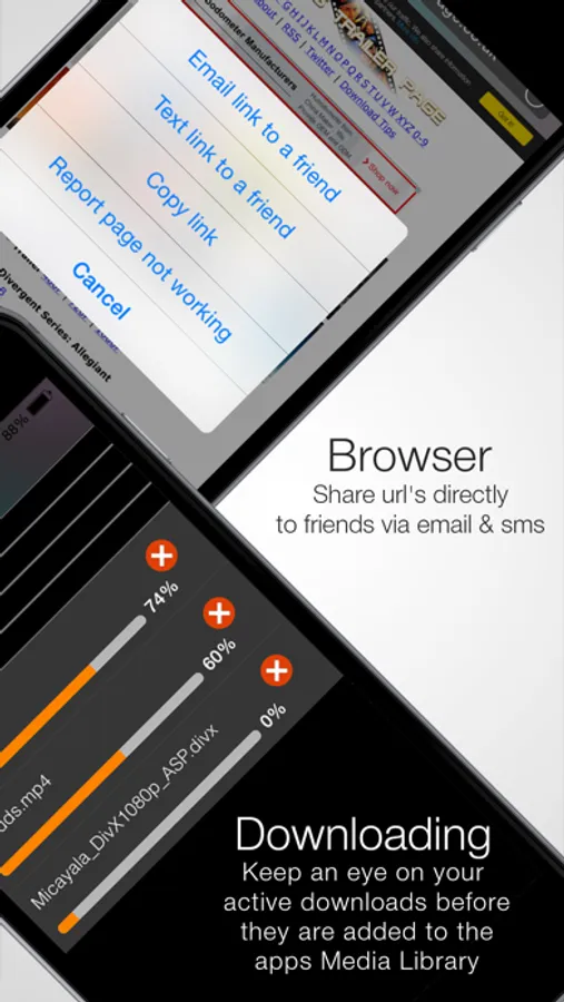 Import from Cloud storage's such as; Dropbox, Google Drive and Box. Integrated Web browser to surf the web and share the url's to friends via email and sms.