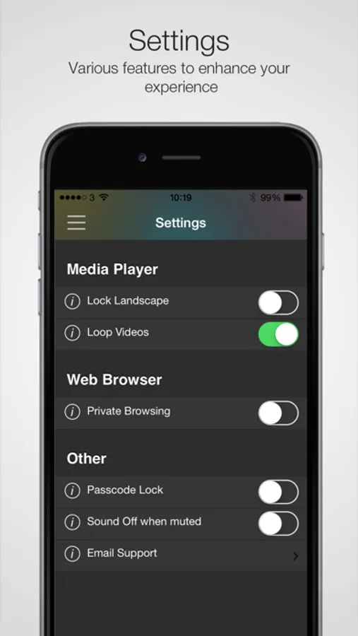 - Various Settings to enhance your experience; Set up a Passcode lock, Lock rotation, Loop videos, Private Web Browsing and more...