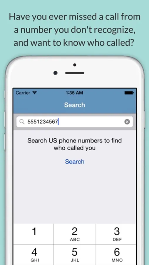 The app download includes credits for 4 number searches and supports US phone numbers.