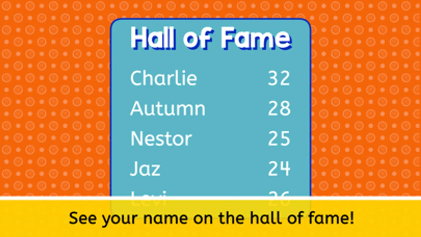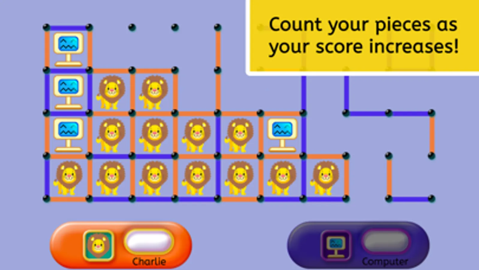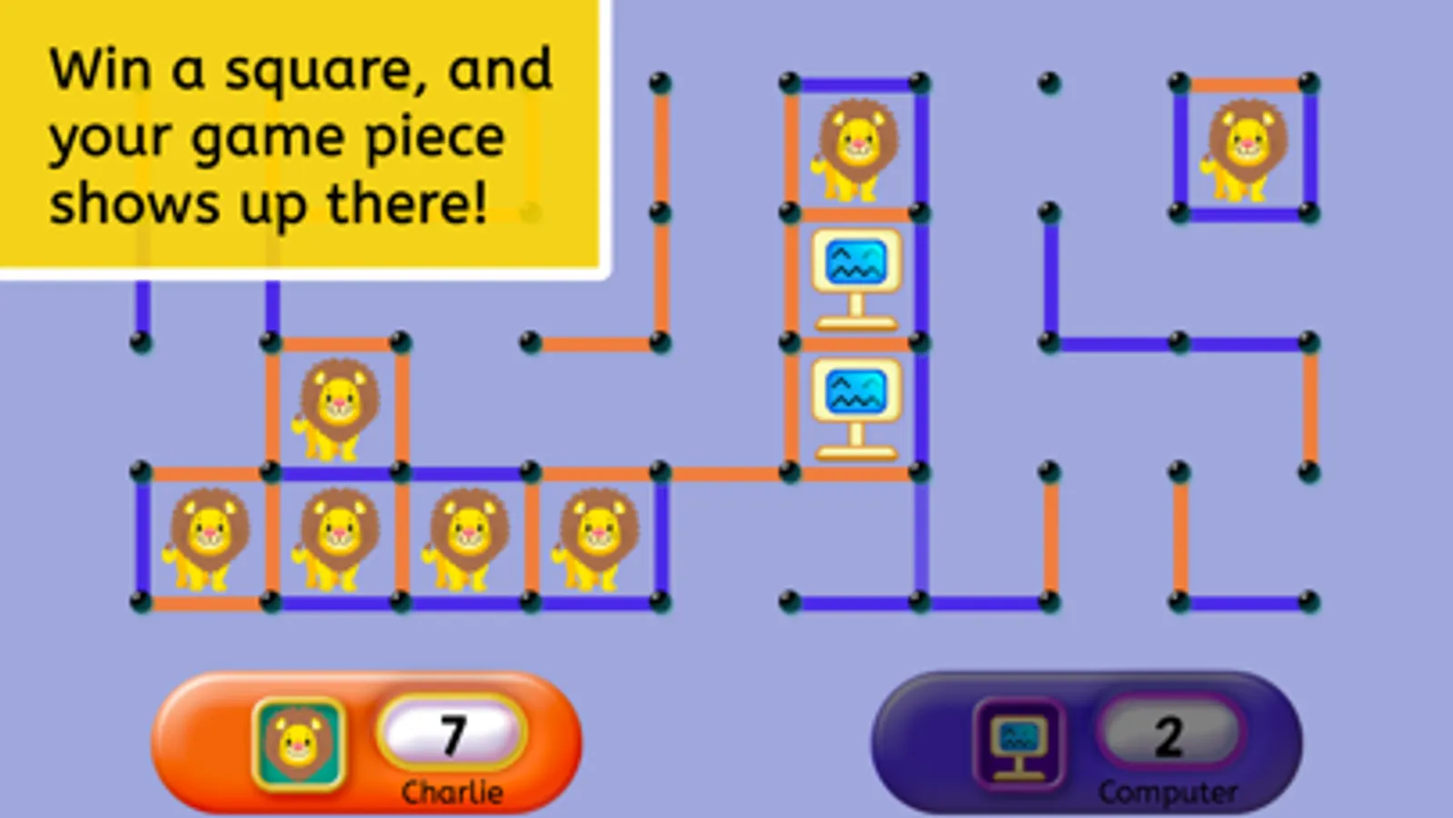 Compete with a friend in two-player mode or play against a built-in opponent. Choose from three levels of play for added challenge. The goal is to complete the most squares. Players take turns placing a line (vertical and horizontal lines only) between adjacent dots. Touch between the dots to add a line. With one-person play, make the first move, and the app’s built-in opponent moves immediately after. The line it adds will continue to blink until your next move. It takes four lines to make a square. Be careful, so your human or electronic competitor doesn’t add the fourth line! An “ownership” icon will appear in each square, depending on who completes the fourth line. The score indicator at the bottom of the screen shows which player’s turn is next. The game continues until all the squares are completed, and the winner is the player with the most squares. Choosing “Play” at the end of a game shuffles the puzzle for a new challenge and the opportunity to improve. Names and scores get tracked in the player Hall of Fame. Beat your last score with the next game, and move up in the ranking!