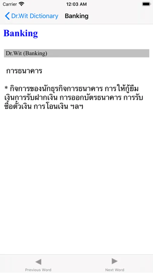 The Most Definitions and Most Entries Bilingual Desk English-Thai Banking Dictionary: The business of a bank or of a banker.: transacting business with a bank; The depositing or withdrawing funds or requesting a loan etc., The engaging in the business of banking; maintaining savings and checking accounts and issuing loans and credit etc.