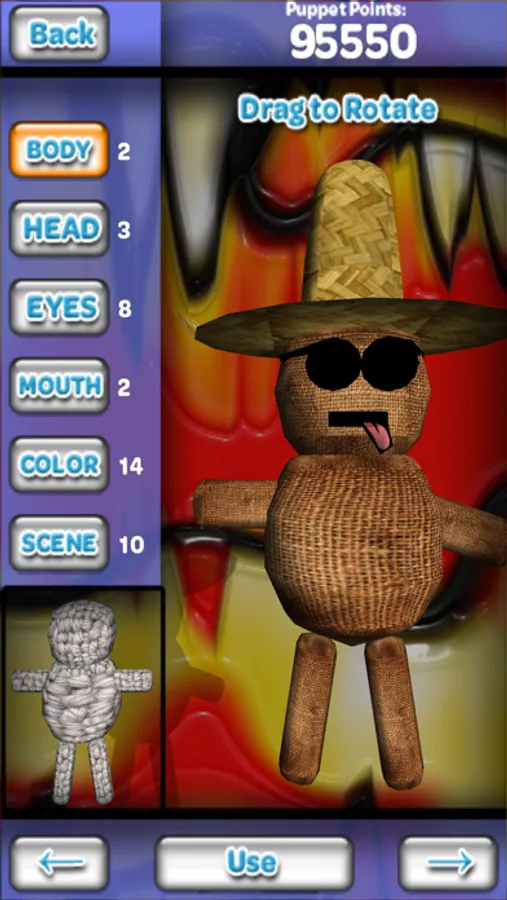 Customization is extensive with the ability to change your puppet's body, hat, eyes, mouth, material and choose from 10 different backgrounds to give almost a million unique combinations.