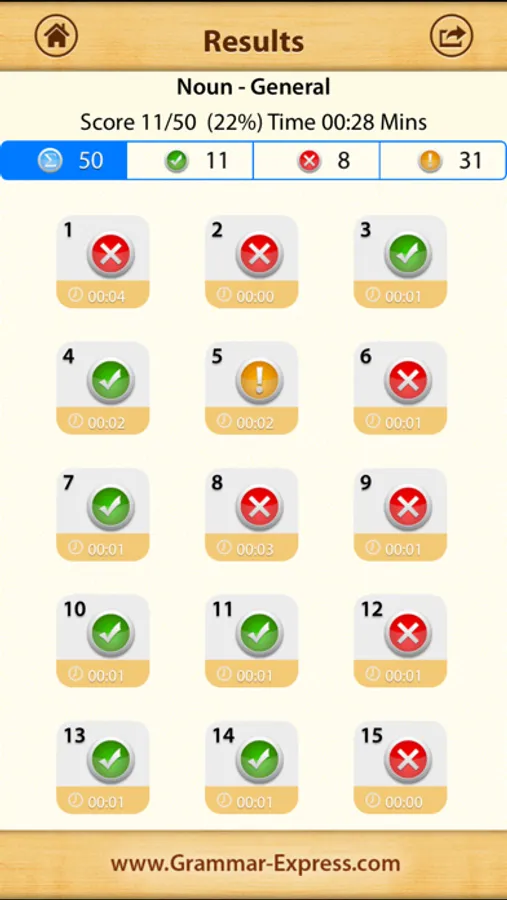 A summary of the practice test is presented at the end of each test. It shows you the time you took, the score, which questions you answered correctly and where you were wrong.