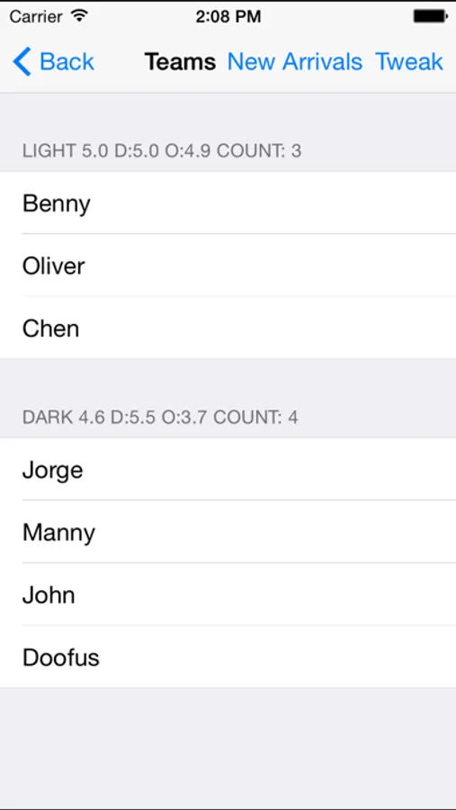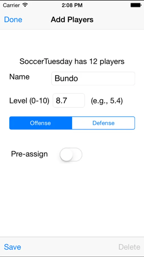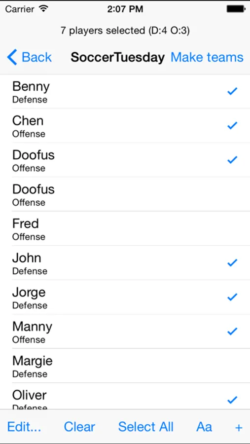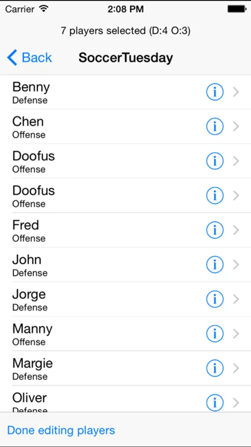 If you wish, you can balance the number of offense and defense players on each team, and you can pre-assign players to a specific team. If players show up after teams have been made, TeamChooser lets you freeze the assignments and add the new players to the teams. Also, you can manage any number of games, each with different players.