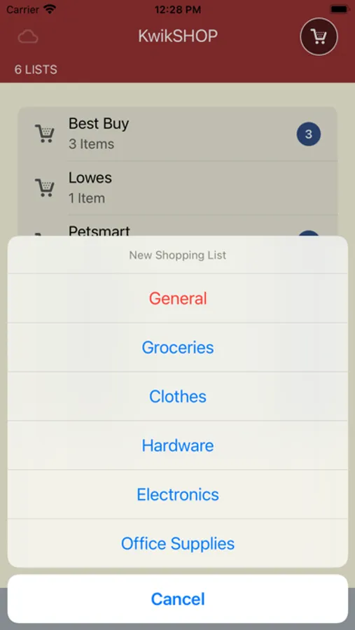 * Choose from one of the pre-defined shopping-list types -- Groceries, Clothes, Hardware, Electronics, and Office Supplies -- and then customize your list to have the categories that you need for your items.