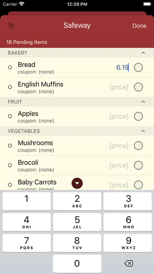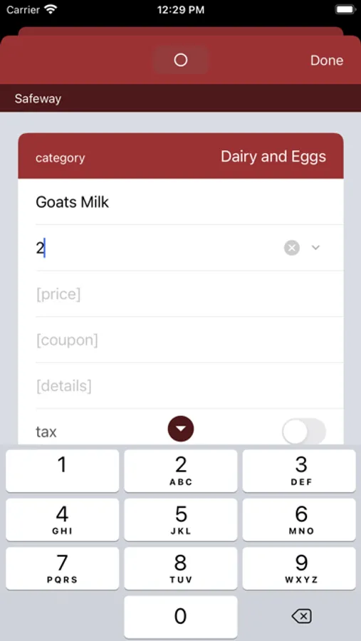 * Every item includes fields for inputting the item name, quantity, price, coupon, and tax. And a free-form multi-line text field lets you make sure that you know what to get when you get to the store!