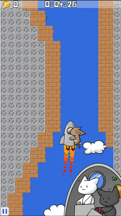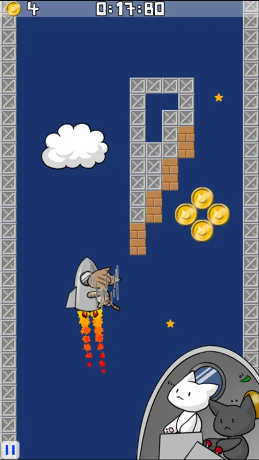 A racing game with comical cats on a rocket hitting a wall and aiming at the goal. Quickly control the crazy rocket with cats by tilting your device.