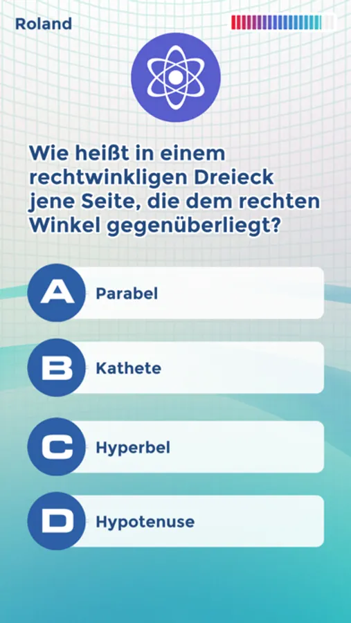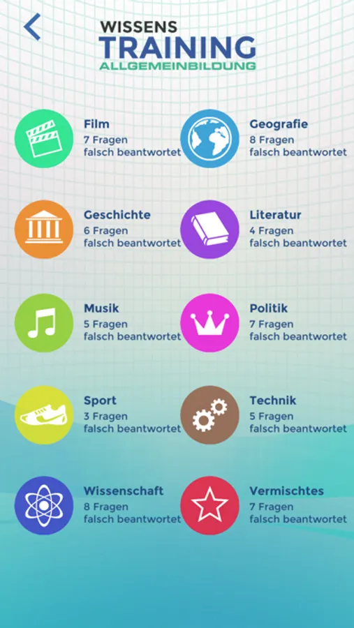 Pro Lektion beantworten Sie 10 Fragen aus 10 Wissensgebieten. Die Schwierigkeit passt sich Ihrer Leistung an: Nach jeder richtig beantworteten Frage folgt eine schwerere, auf jede falsch beantwortete eine leichtere.