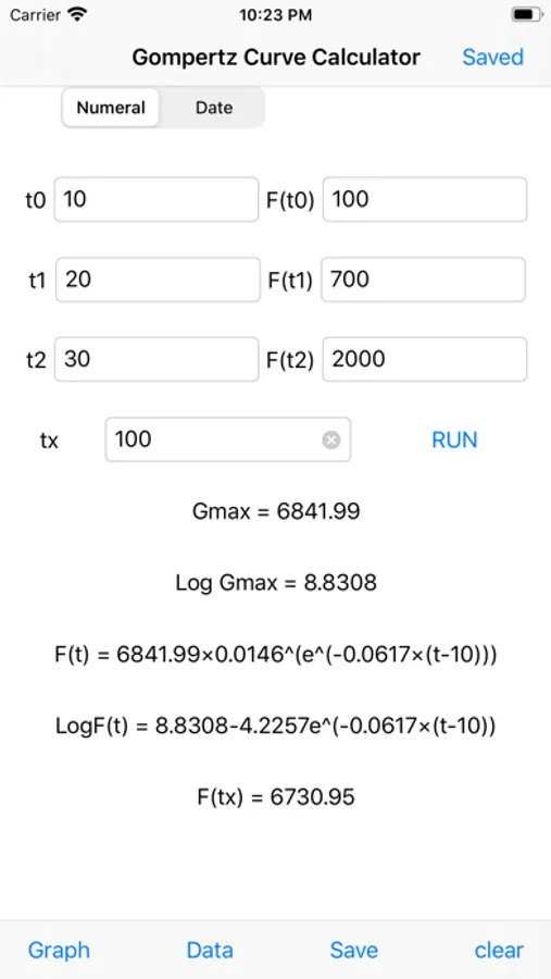Gompertz curve calculator can calculates Gompertz curve from 3-point times (t0, t1, t2) and values (A, B, C).