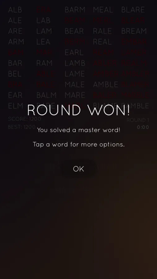 The goal of Wordmaster is to help you learn new words and eventually master the English vocabulary. To this end, Wordmaster gives you two ways to win each round: solve one of the 6-letter words or solve at least 50% of all words in the round.