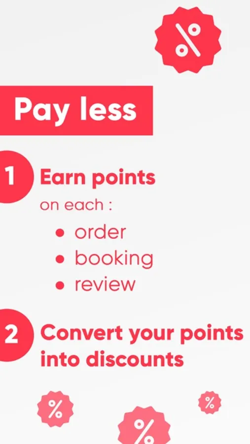 Pay less with our loyalty program: earn points for every order, booking or review, and convert them into discounts.