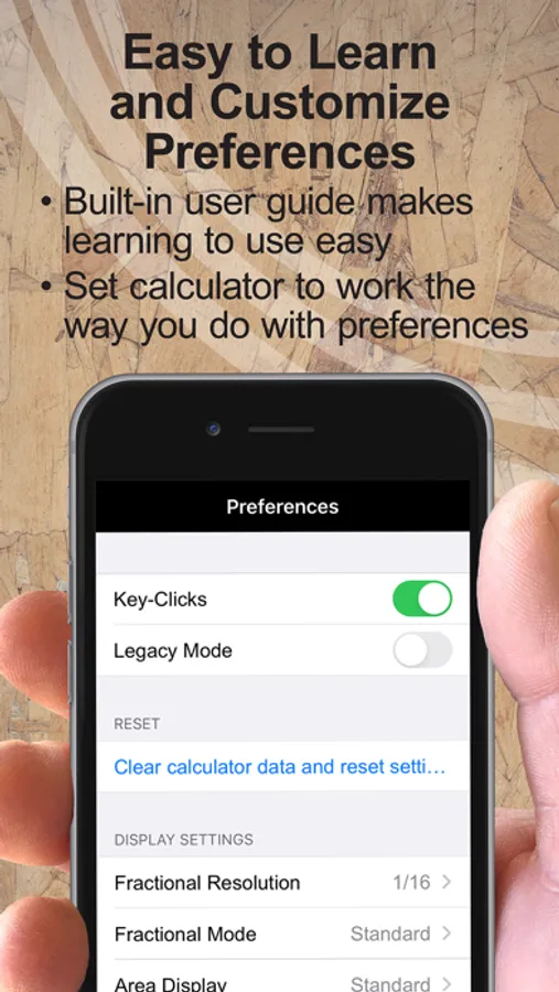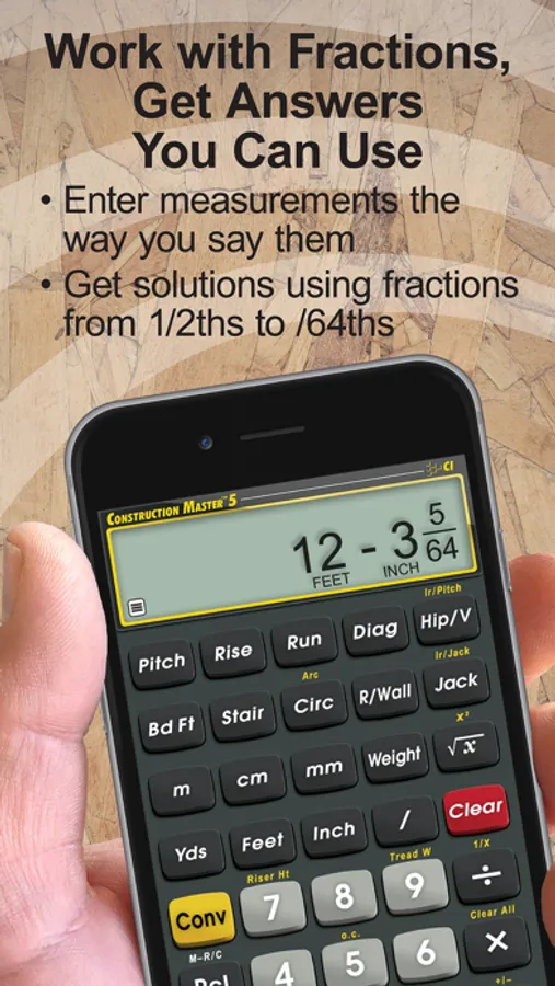 • Work in and convert between all building dimensional formats: feet-inch-fractions, inch fraction, yards, decimal feet (10ths, 100ths), decimal inches and metric (m, cm, mm)