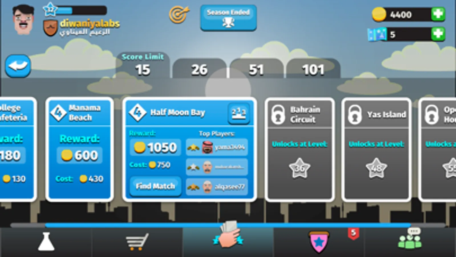 - إكسب خبرة و مستوى أعلى لفتح مراحل مختلفة بإعدادات مختلفة، ٤ أو ٦ لاعبين و حد قيد ٢٦ أو ٥١ أو ١٠١