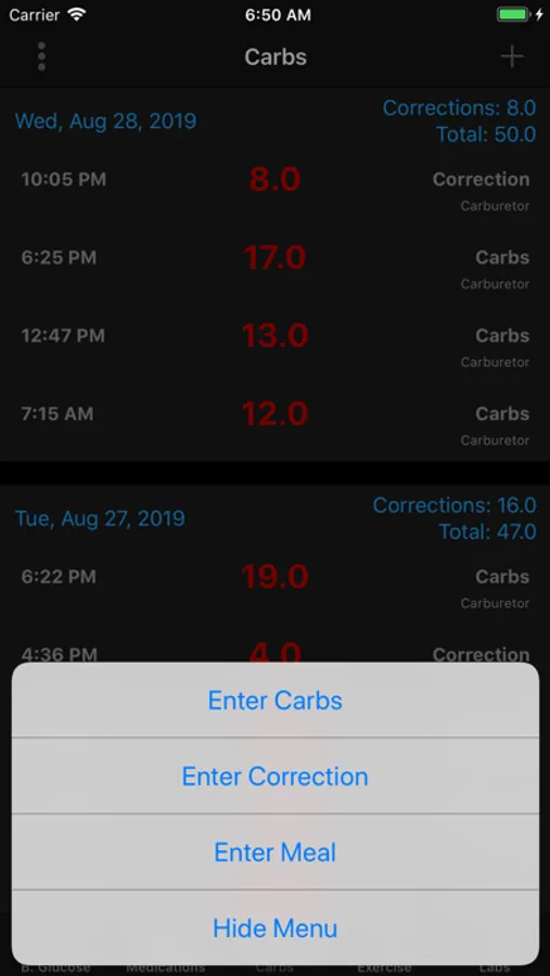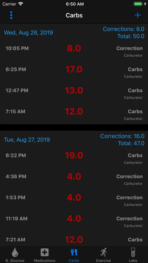 * Displays total daily carb intake & corrections