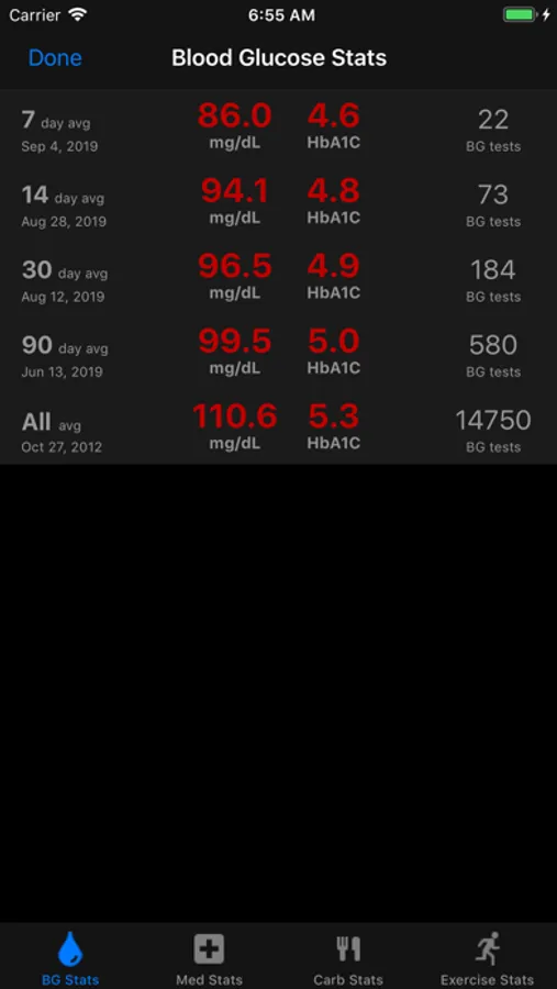 * Statistics view. Averages for medications, carb intake, exercise & 7, 14, 30, 90 days blood glucose averages as well as overall average. Also converts these averages to the equivalent HbA1C value