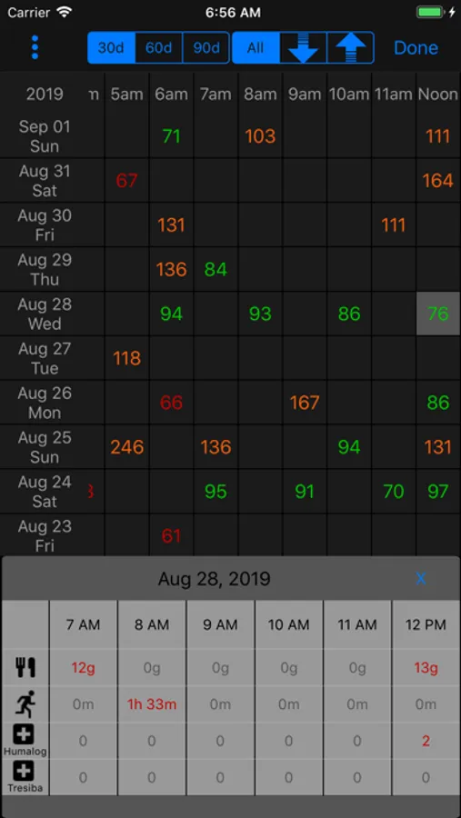 * Log Book view displays all the blood glucose entries for each day in 1 hour increments. 30, 60 & 90 day views with filter for highs & lows