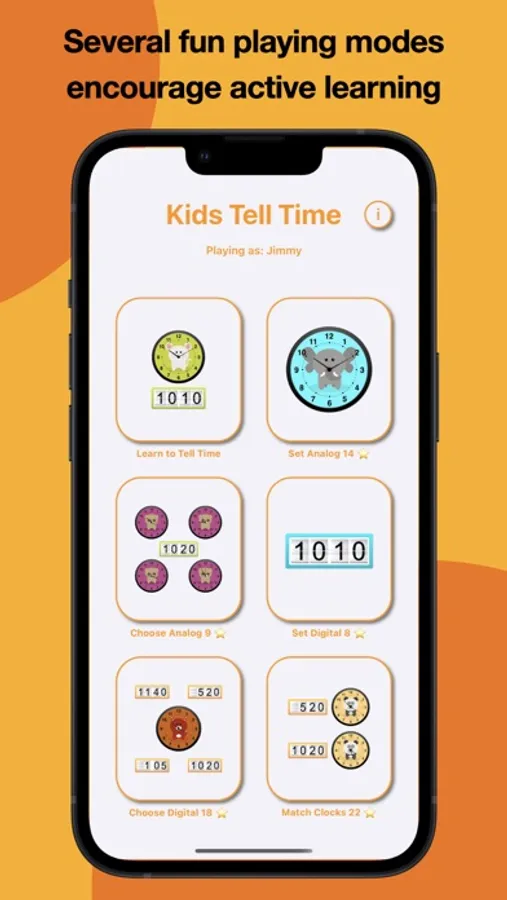 Kids Tell Time is a fun and interactive educational app that helps your little ones learn to tell time using analog and digital clocks. With 6 different game modes available, your kids will pick up the time reading skill fast! The app is designed to maintain their interest and keep them engaged - kids will want to set the clocks again and again!