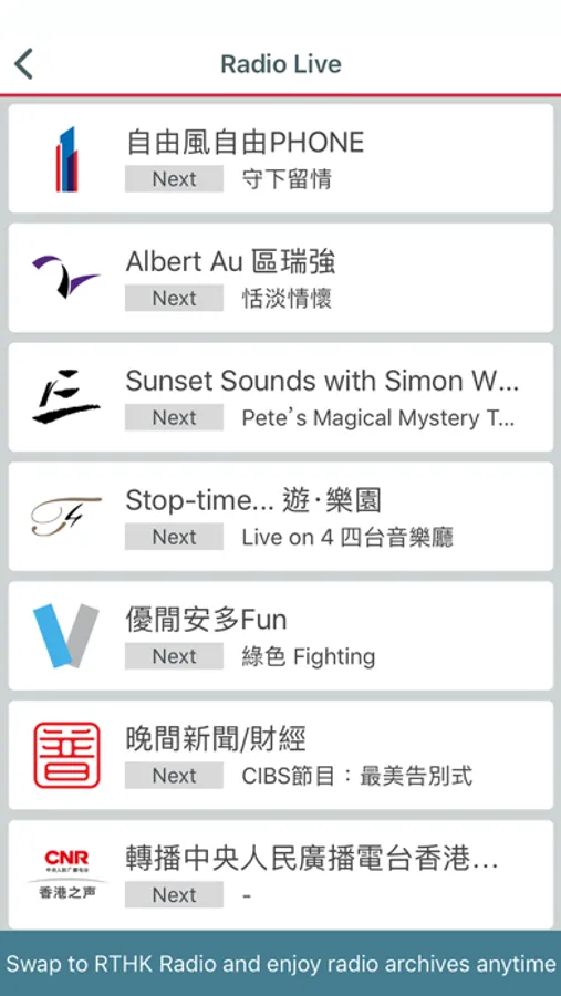 3) Radio Live – provides RTHK 8 live radio channels. In this section, you could swap to “RTHK Radio” and enjoy exclusive videos and radio archives anytime!