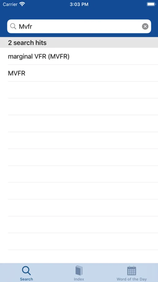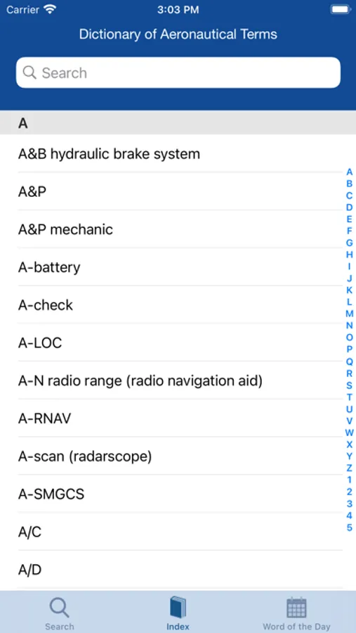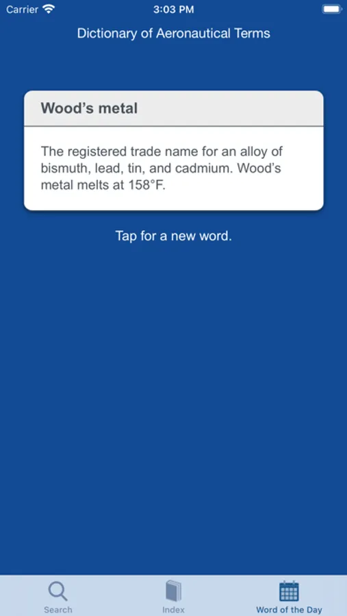 • Word of the Day helps you learn a new aviation term daily; shake-it feature issues a new word on demand.