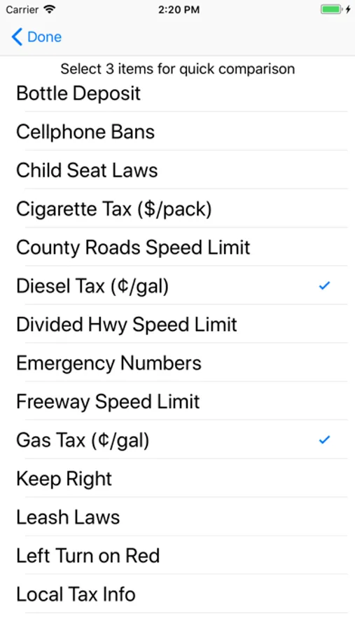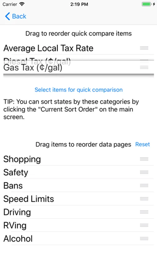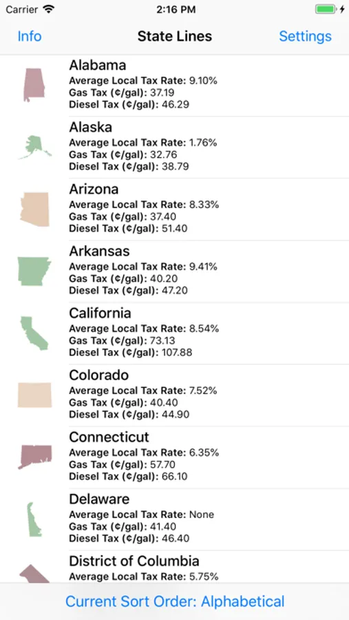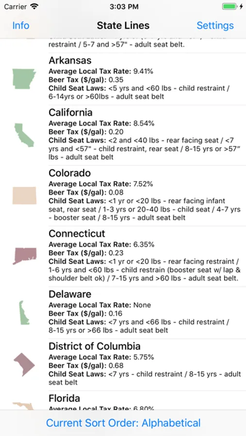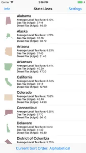 + Custom Sorting: You can sort the state list alphabetically, by distance from you, and by your selected Quick Compare fields. If you’ve ever wanted to see what state has the lowest alcohol or fuel taxes, this feature makes it easy!