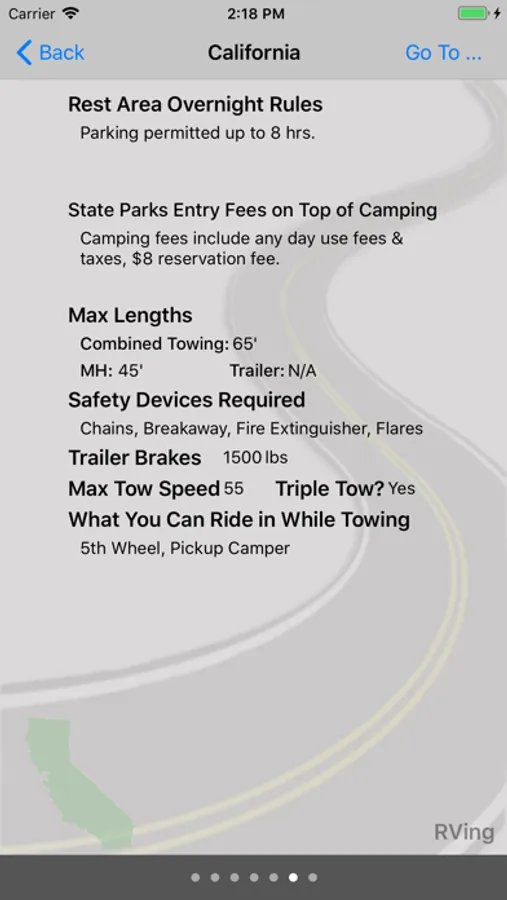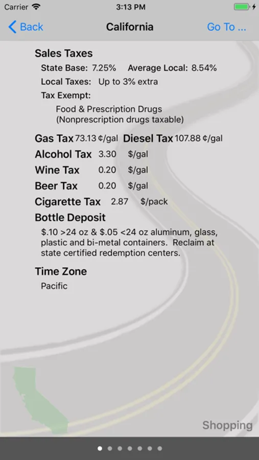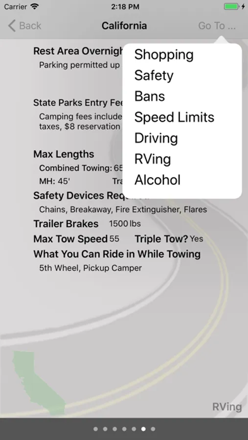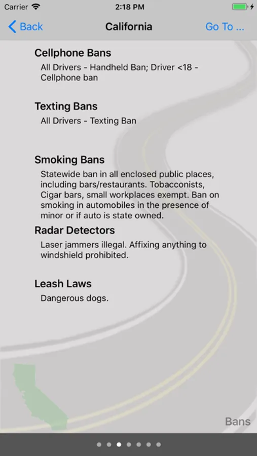 Currently State Lines tracks over 55 pieces of travel relevant information for each of the 50 states; including cell phone & texting bans, seat belt & child safety seats, state sales tax exemptions, gas/diesel taxes, bottle deposits, time zones, towing & RV specific laws, rest area overnight parking limits, state park camping entrance fees, default speed limits, radar detectors, highway emergency #s, alcohol sales laws & taxes, smoking bans, open container laws, pet leash laws, bicycle helmet laws, motorcycle laws (helmet, lights, eye protection & lane sharing), left turns on red, u-turns, keep right and more.