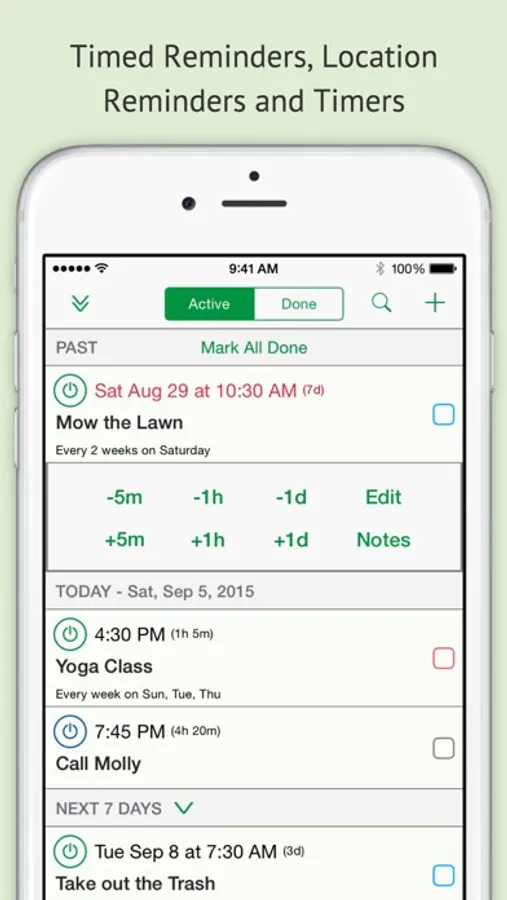 • Supports Interactive Notifications, which allow you to mark reminders done, snooze reminders, restart timers -- directly from the notification (lock screen, Notification Center, Apple Watch).